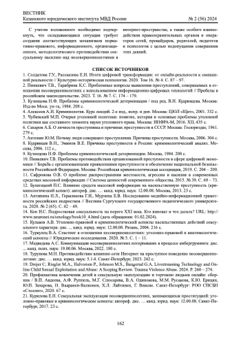 2. Пинкевич Т.В., Тарабрина К.С. Проблемные вопросы выявления преступлений, совершаемых в отношении несовершеннолетних с использованием информационно-цифровых технологий // Пробелы в российском законодательстве. 2023. Т. 16. № 7. С. 174 - 179. EDN: RYMZIH
