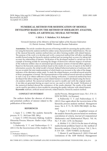 В статье рассматривается процесс формирования моделей для оценки показателя качества с использованием метода анализа иерархий, в предметных областях, которые характеризуются связанными признаками. Применение классического метода анализа иерархий не позволяет формировать модели со связанными признаками. Целью работы является разработка и верификация численного метода, который позволит модифицировать модели, сформированные с использованием метода анализа иерархий и увеличить их точность благодаря учету связи признаков. Верификация разработанного метода выполнена на примере формирования моделей оценки опасности деструктивных программных воздействий вредоносных программ класса вредоносные утилиты на автоматизированные системы специального назначения органов внутренних дел. На основе метода анализа иерархий, исходя из результатов опроса специалистов в области обеспечения информационной безопасности, сформирована исходная модель. Выявлены связанные поведенческие паттерны вредоносных утилит, совместная реализация которых, приводит к повышению значения показателя опасности исследуемой альтернативы. Для исследования связанных признаков сформирована искусственная нейронная сеть прямого распространения. Гиперпараметры искусственной нейронной сети определены таким образом, чтобы получить достаточную точность при верификации. Разработан численный метод, позволяющий учитывать связанные признаки в моделях, разработанных с использованием метода анализа иерархий. С использованием численного метода выполнена модификация и верификация исходной модели. Для верификации модели использовался тестовый набор данных, сформированный в ходе опроса экспертов. Верификация численного метода показала непротиворечивость полученных результатов. Результаты исследования могут быть использованы специалистами для формирования моделей оценки показателя качества, при связанных признаках.