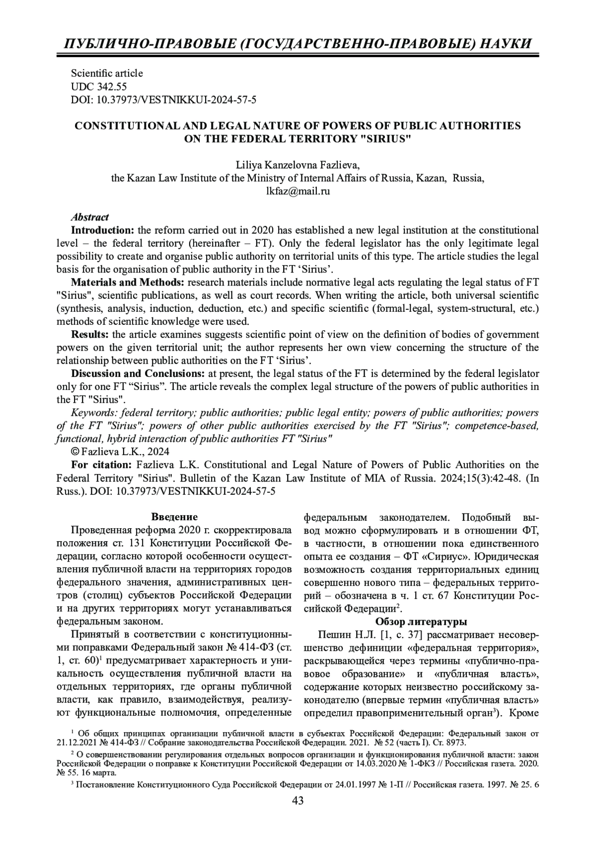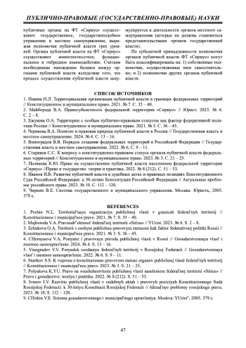 1. Пешин Н.Л. Территориальная организация публичной власти в границах федеральных территорий // Конституционное и муниципальное право. 2021. № 7. С. 35 - 40. EDN: PSRGBY