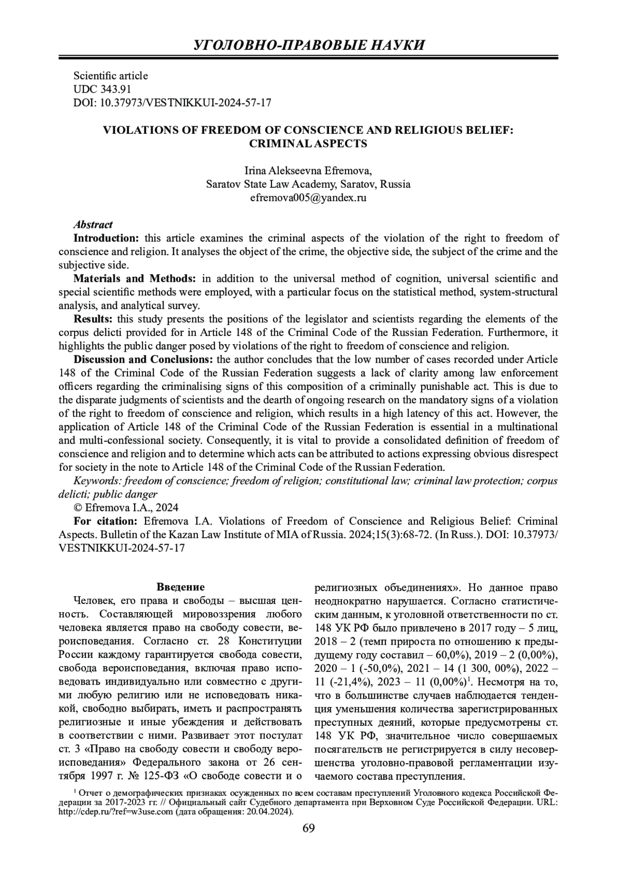 Введение: в статье рассматриваются проблемные аспекты уголовно-правового характера, возникающие при нарушении права на свободу совести и вероисповеданий; анализируются объект преступления, объективная сторона, субъект преступления и субъективная сторона. Материалы и методы: наряду со всеобщим методом познания применялись общенаучные и частнонаучные методы: прежде всего, статистический метод, системно-структурный анализ, аналитическое обследование. Результаты исследования: представлена позиция законодателя и ученых относительно элементов состава преступления, предусмотренного ст. 148 Уголовного кодекса Российской Федерации. Обозначена общественная опасность нарушения права на свободу совести и вероисповеданий. Обсуждение и заключение: автор констатирует, что незначительное количество зарегистрированных преступлений, предусмотренных ст. 148 УК РФ, свидетельствует о проблемах понимания правоприменителями криминообразующих признаков данного состава уголовно-наказуемого деяния. Это обусловлено различными суждениями ученых и недостаточностью проводимых исследований обязательных признаков нарушения права на свободу совести и вероисповеданий, что порождает высокую латентность этого деяния. Но применение ст. 148 УК РФ необходимо в многонациональном и поликонфессионом обществе. Поэтому в примечании к ст. 148 УК РФ необходимо закрепить дефиниции свободы совести и вероисповеданий; определить, какие деяния следует отнести к действиям, выражающим явное неуважение к обществу.