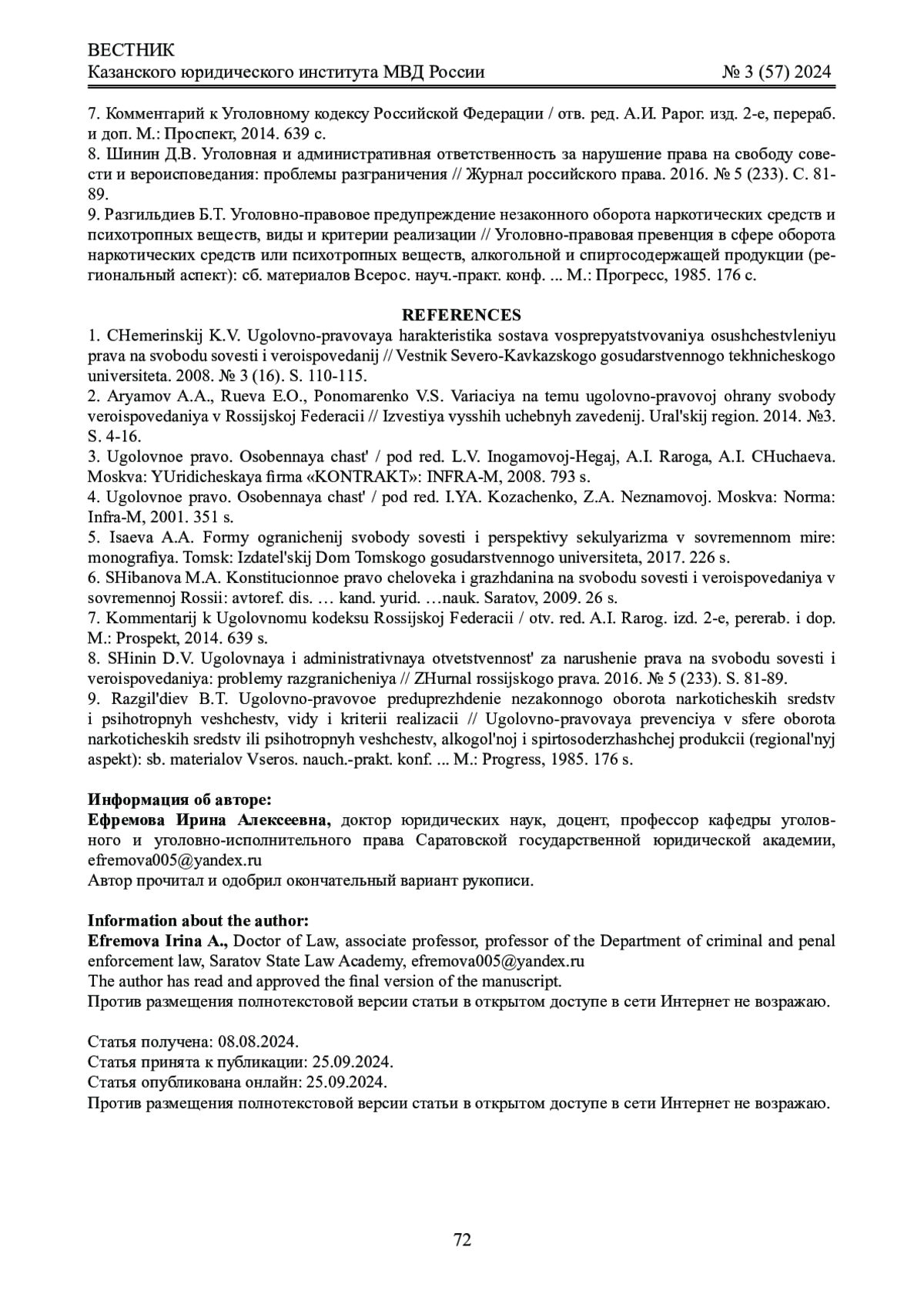 8. Шинин Д.В. Уголовная и административная ответственность за нарушение права на свободу совести и вероисповедания: проблемы разграничения // Журнал российского права. 2016. № 5 (233). С. 81-89.
