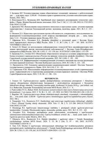 12. Скрипченко Н.Ю. Использование информационно-телекоммуникационных сетей в криминальных целях: нормативный учет и перспективы расширения уголовно-правового значения // Вестник РУДН. Серия Юридические науки. 2024. Т. 28. № 1. С. 196 - 214. EDN: QXGMAB