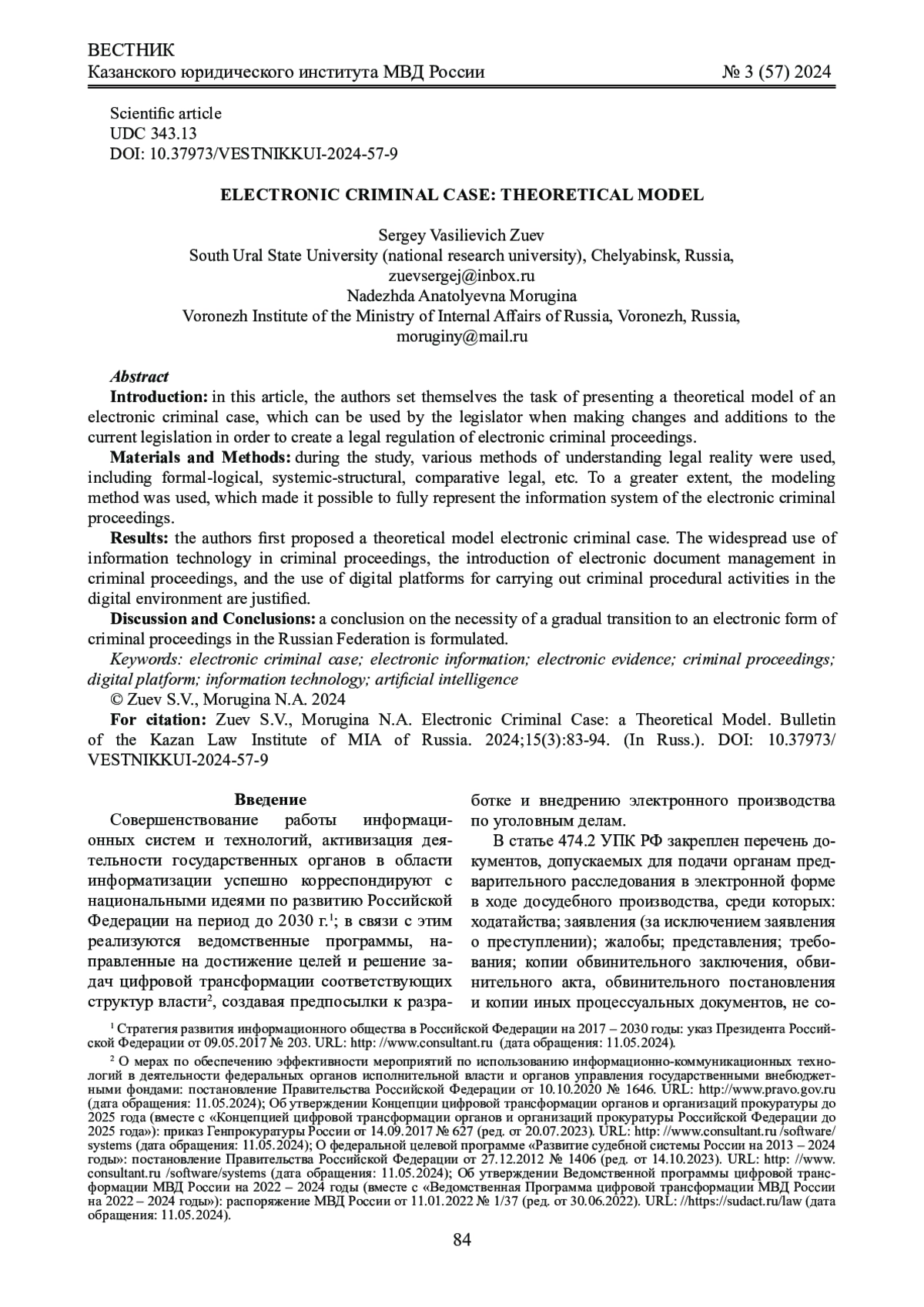 Введение: в статье представлена теоретическая модель электронного уголовного дела, которая может быть использована законодателем при внесении изменений и дополнений в действующее законодательство для создания правовой регламентации электронного производства по уголовным делам.