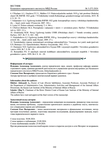 7. Сулейманов А.А. Уголовный кодекс РСФСР 1922 года: концептуальные основы и общая характеристика: дис.... канд. юрид. наук. Ульяновск, 2007. 194 с. EDN: NOYTRH