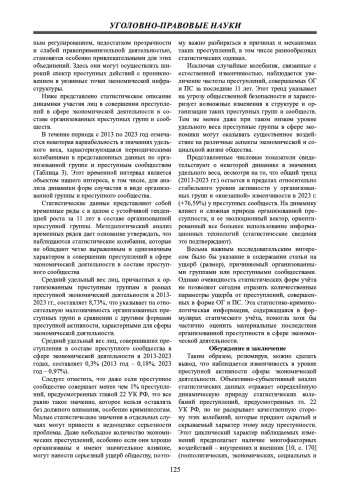 Обсуждение и заключение: автор пришел к выводу, что: 1. Числовые показатели преступлений в сфере экономической деятельности свидетельствуют о нестабильности динамики выявления и регистрации преступлений, предусмотренных главой 22 УК РФ, за период 11 лет. 2. Количественная динамика лиц, совершивших преступления в экономической сфере, обнаруживает в целом тенденцию к стабильному увеличению. 3. Организованная преступность в современном контексте выступает не просто как совокупность преступных действий, а как ключевой компонент сферы экономической деятельности.