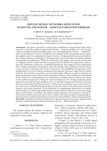 2. Alymova Е. V., Kudryavtsev O. E. Artificial Neural Networks and Wiener-Hopf Factorization // IAENG International Journal of Computer Science. - 2024. - Vol. 51, Iss. 8. - P. 1182-1194.