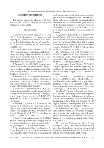 8. Пармузин Е. И. Вариационная ассимиляция данных спутниковых наблюдений в модели гидротермодинамики моря / Е. И. Пармузин, В. И. Агошков, Н. Б. Захарова, В. П. Шутяев // Информационные технологии в дистанционном зондировании Земли - RORSE 2018: электр. сб. статей участников 16-й конф. Института космических исследований Российской академии наук (Москва, 12-16 ноября 2018 г.). - Москва, 2018. - С. 1-8. DOI: 10.21046/21DZZconf-2023a