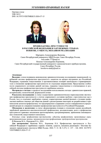 Результаты исследования: в статье осуществлено криминологическое переосмысление институции профилактики преступности с учетом современного состояния проблем с преступностью как в России, так и в отдельных зарубежных странах; охарактеризован данный феномен с позиции профилактики наиболее опасных для общества деяний с рассмотрением некоторых не разработанных в криминологии аспектов профилактики, что предопределило содержание статьи и направленность предложений авторов по совершенствованию профилактики преступности в Российской Федерации.