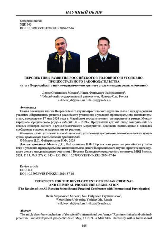 Статья посвящена итогам Всероссийского научно-практического круглого стола с международным участием «Перспективы развития российского уголовного и уголовно-процессуального законодательства», прошедшего 17 мая 2024 года в Марийском государственном университете в рамках Международного юридического форума «Марий Эл - 2024». Представлен краткий обзор выступлений основных спикеров данного научно-практического мероприятия, освещены поднимаемые в докладах проблемные вопросы и направления их решения.