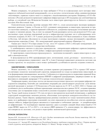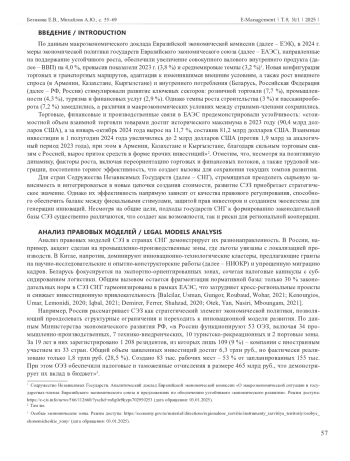 Эта работа представляет собой комплексное исследование международного инвестиционного сотрудничества и концепции эффективности инноваций на рынке капитала в свободных экономических зонах (далее – СЭЗ) и их роли в современном мире. СЭЗ являются новыми центрами компетенций в различных социально-экономических и производственных сферах, способствуя развитию международного инвестиционного сотрудничества. В условиях современных рыночных отношений они могут стать катализатором структурных преобразований, стимулируя инновации, привлечение капиталовложений и обмен технологиями. Так, в условиях глобальной экономической трансформации и усиления конкуренции за технологическое лидерство СЭЗ становятся ключевым инструментом стимулирования инноваций и привлечения инвестиций. Финансовая деятельность, являясь ключевой сферой экономики, не только обеспечивает стабильность и устойчивость хозяйствующих субъектов, но и выступает драйвером инноваций, которые критически важны для повышения конкурентоспособности, оптимизации ресурсного управления и адаптации к глобальным вызовам, таким как цифровизация и санкционное давление. Анализ правовых моделей СЭЗ в странах Содружества Независимых Государств демонстрирует их разнонаправленность. В Российской Федерации, например, акцент сделан на промышленно-производственных зонах, где льготы увязаны с локализацией производств. В Китае, напротив, доминируют инновационно-технологические кластеры, предлагающие гранты на научно-исследовательские и опытно-конструкторские работы и упрощенную миграцию кадров.