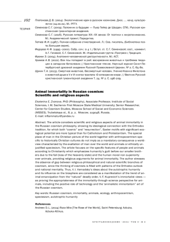 Статья посвящена анализу научных и религиозных аспектов феномена бессмертия животных в философской оптике русского космизма. Раскрывается идейная преемственность между русским космизмом и православной традицией, для которой обладающие значительным экологическим потенциалом «космические», а также «воскресные», пасхальные мотивы свойственны более, нежели для католицизма и протестантизма. Обосновывается следующая точка зрения: особое место человеческого существа в христианской картине мира, специфический для исторически христианских культур антропоцентризм не предполагают по умолчанию формирования мировоззрения, характеризующегося превозношением человека над тварным миром и животными, не подразумевают в обязательном порядке этически неоправданного спесишизма. Анализируются специфические черты людей и животных, согласно христианству, раскрывается связанная с грехопадением, утратой райского состояния вина человека по отношению к нашим меньшим братьям, его моральное непревосходство над ними, приводятся религиозные доводы в пользу признания бессмертия представителей животного мира. Подчеркивается отсутствие разрыва между религиозно-философской и естественнонаучной ветвями космизма, пронизанность мышления ученых-космистов паттернами православного мировоззрения и национального менталитета. Идеи В. И. Вернадского об автотрофном человечестве и его влиянии на биосферу рассматриваются в качестве проявления тенденции к освобождению животных от «естественного» смертоносного порядка. Раскрывается имморталистическое содержание воззрений В. Ф. Купревича, обозначается уместность распространения перспективы обретения бессмертия посредством науки на животных. Обосновывается положительная роль техники в том, что касается избавления животных от смерти. Освещается «анималистический иммортализм» искусства русского космизма.