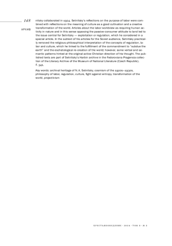 В настоящую публикацию включены архивные статьи и заметки Николая Александровича Сетницкого (1888-1937), философа, экономиста, статистика, одного их ведущих представителей той линии ноосферной, космической мысли 1920-1930-х гг., которая связана с продолжением и творческим развитием идей Н. Ф. Федорова. Публикуемые материалы относятся к 1923-1924 гг., когда Сетницкий жил и работал в Москве и совместно со своими друзьями-единомышленниками А. К. Горским и В. Н. Муравьевым занимался актуальной для первого пореволюционного десятилетия проблемой труда и научной организации труда. В отличие от теоретиков НОТ, мыслители-космисты федоровской ориентации трактовали труд как мироустроительную, космизующую и организующую деятельность человека в природе, направленную на преодоление хаоса, смерти, распада, как силу, противостоящую энтропии. Ряд публикуемых материалов предназначался для журнала «Октябрь мысли», с которым в 1924 г. активно сотрудничали Горский и Сетницкий. Размышления о цели труда соединялись с размышлениями о смысле культуры как благого возделывания и творческого преобразования мира. Статьи, связанные с проблемой трудового мироотношения, требующего активности человека в природе и противостоящего в этом смысле пассивно-потребительскому отношению к земле, выводили к выдвинувшейся в центр внимания для Сетницкого теме «Эксплуатация или регуляция?», разработку которой он вел в специальной статье. В подтексте статей, предназначавшихся для советской аудитории, был практически нивелирован религиозно-философский план трактовки понятий регуляции, труда и культуры, возводившихся Сетницким к исполнению заповеди «обладания землей», к эсхатологическому пересозданию мира, но некоторые словесные и смысловые обороты намекали на источную активно-христианскую направленность мысли философа. Публикуемые тексты хранятся в составе харбинского архива Н. А. Сетницкого в собрании Fеdoroviana Pragensia Литературного архива Музея национальной письменности (Чешская Республика). Ф. 341.