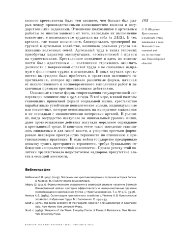 2. Мерль Ш. (2017). Формы местного управления в советской деревне накануне Великой Отечественной войны: критерии эффективности и коммуникативные практики предотвращения крестьянских бунтов // Крестьяноведение. Т. 2. № 2. С. 53-76. EDN: ZCINFB