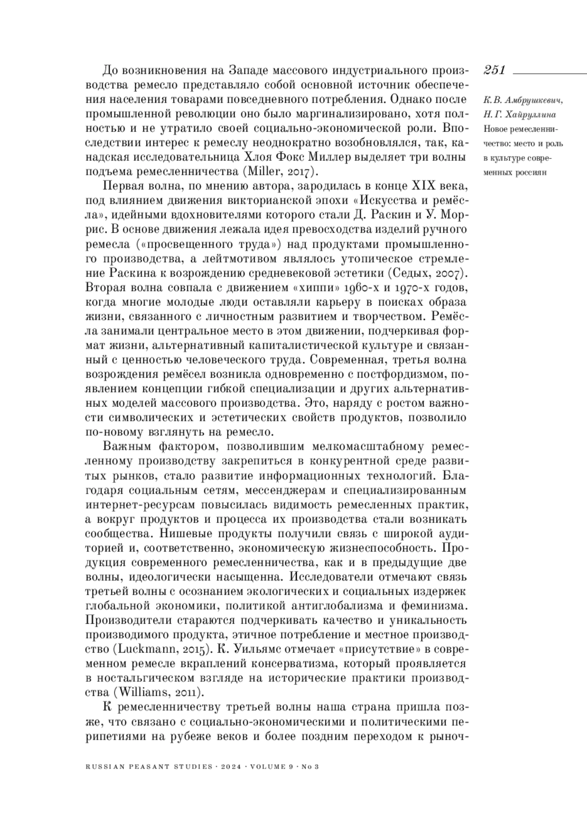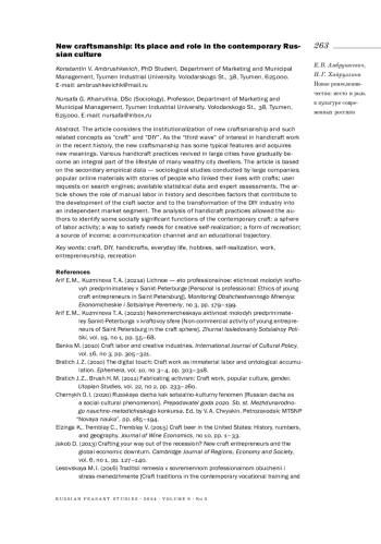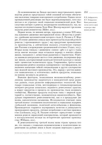 АМБРУШКЕВИЧ К. В., ХАЙРУЛЛИНА Н. Г. НОВОЕ РЕМЕСЛЕННИЧЕСТВО: МЕСТО И РОЛЬ В КУЛЬТУРЕ СОВРЕМЕННЫХ РОССИЯН // КРЕСТЬЯНОВЕДЕНИЕ. 2024. Т. 9 № 3