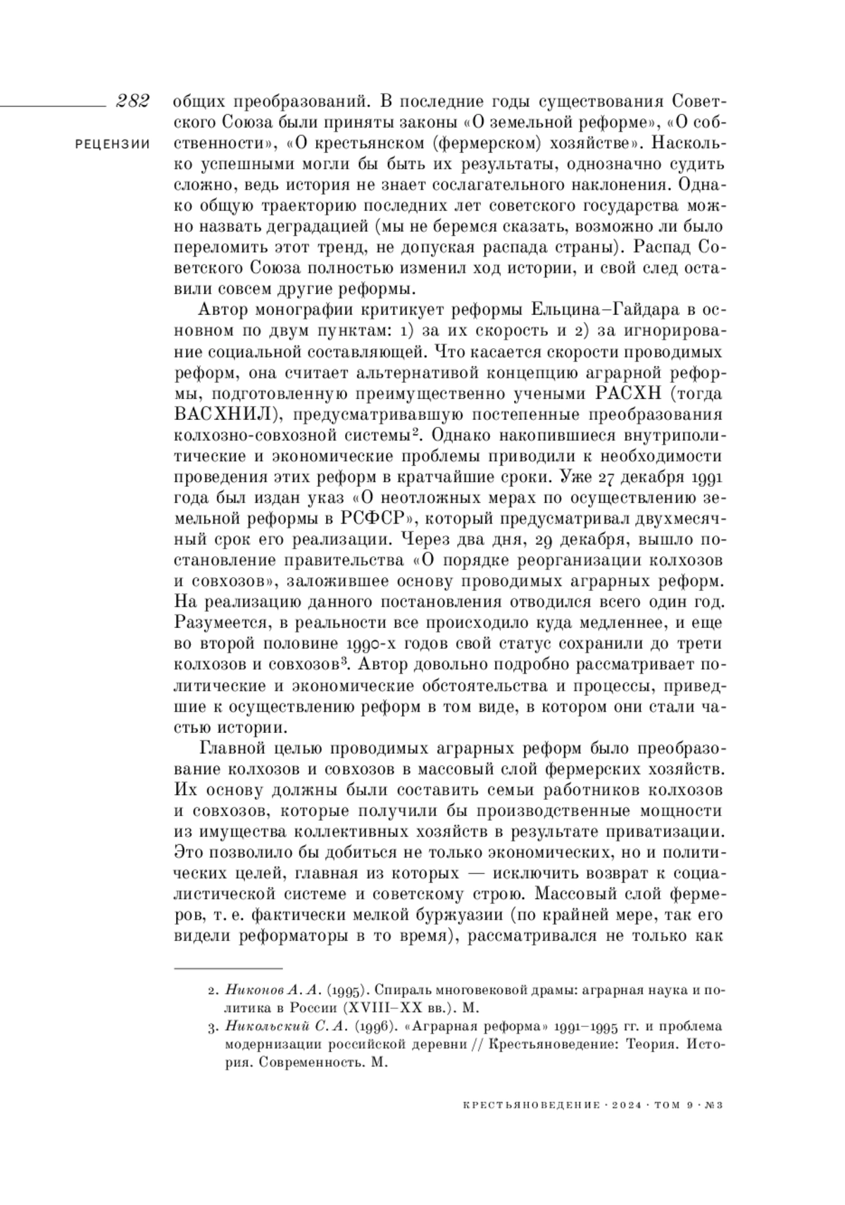 1. Никольский С. А. (1996). “Аграрная реформа” 1991-1995 гг. и проблема модернизации российской деревни // Крестьяноведение: Теория. История. Современность. М.
