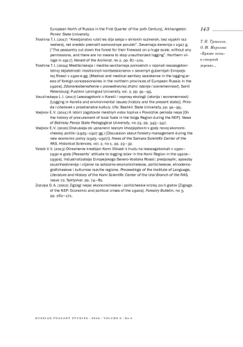 13. Трошина Т. И. (1917). “Крестьянство рубит лес для себя в широких размерах, без всяких разрешений, нет средств прекратить самовольные порубки”. Северная деревня в 1917 г. // Вестник архивиста. № 2. С. 87-101.