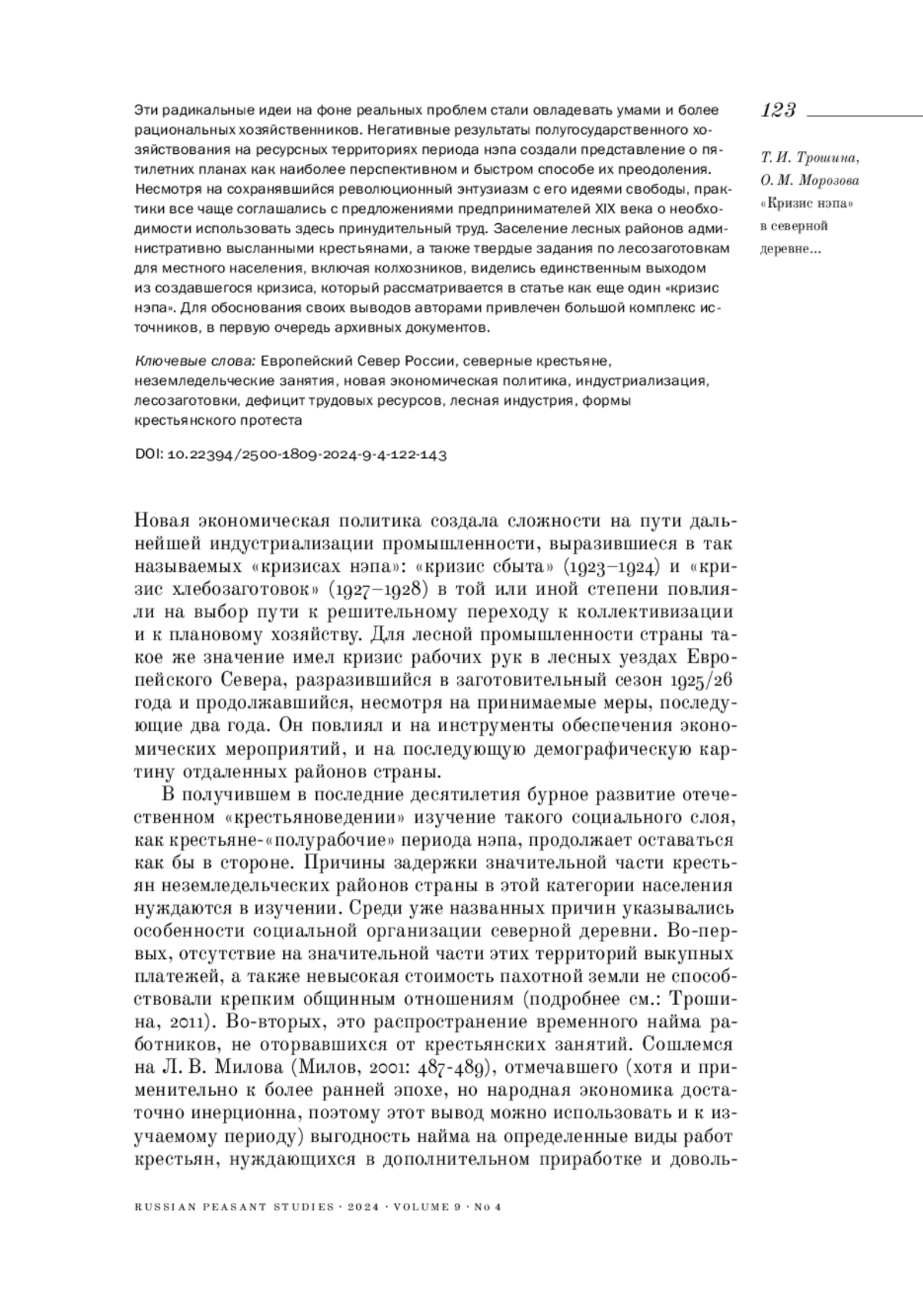 7. Дианова Е. В. (2019). Быт лесозаготовителей Европейского Севера (1920-е - начало 1930-х гг.) // Природно-географические факторы в повседневной жизни населения России: история и современность (региональный аспект). СПб.: ЛГУ им. А. С. Пушкина. С. 284-290. EDN: QNTPPW