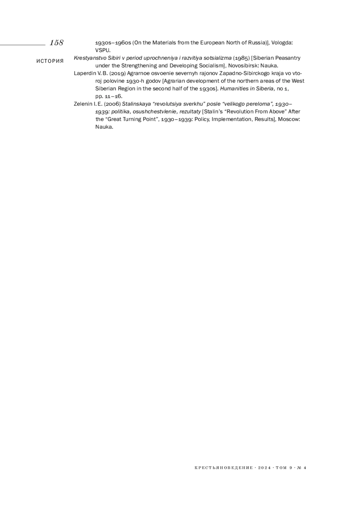 10. Лапердин В. Б. (2019). Аграрное освоение северных районов Западно-Сибирского края во второй половине 1930-х годов // Гуманитарные науки в Сибири. № 1. С. 11-16.