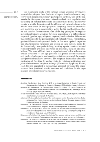 4. Astafieva O. N. (2010) Cultural needs of the contemporary youth: Changing priorities. Cultural. Needs of the Youth: Dynamics under the Social-Cultural Changes, Moscow: RAGS Publishing House. (In Russian).