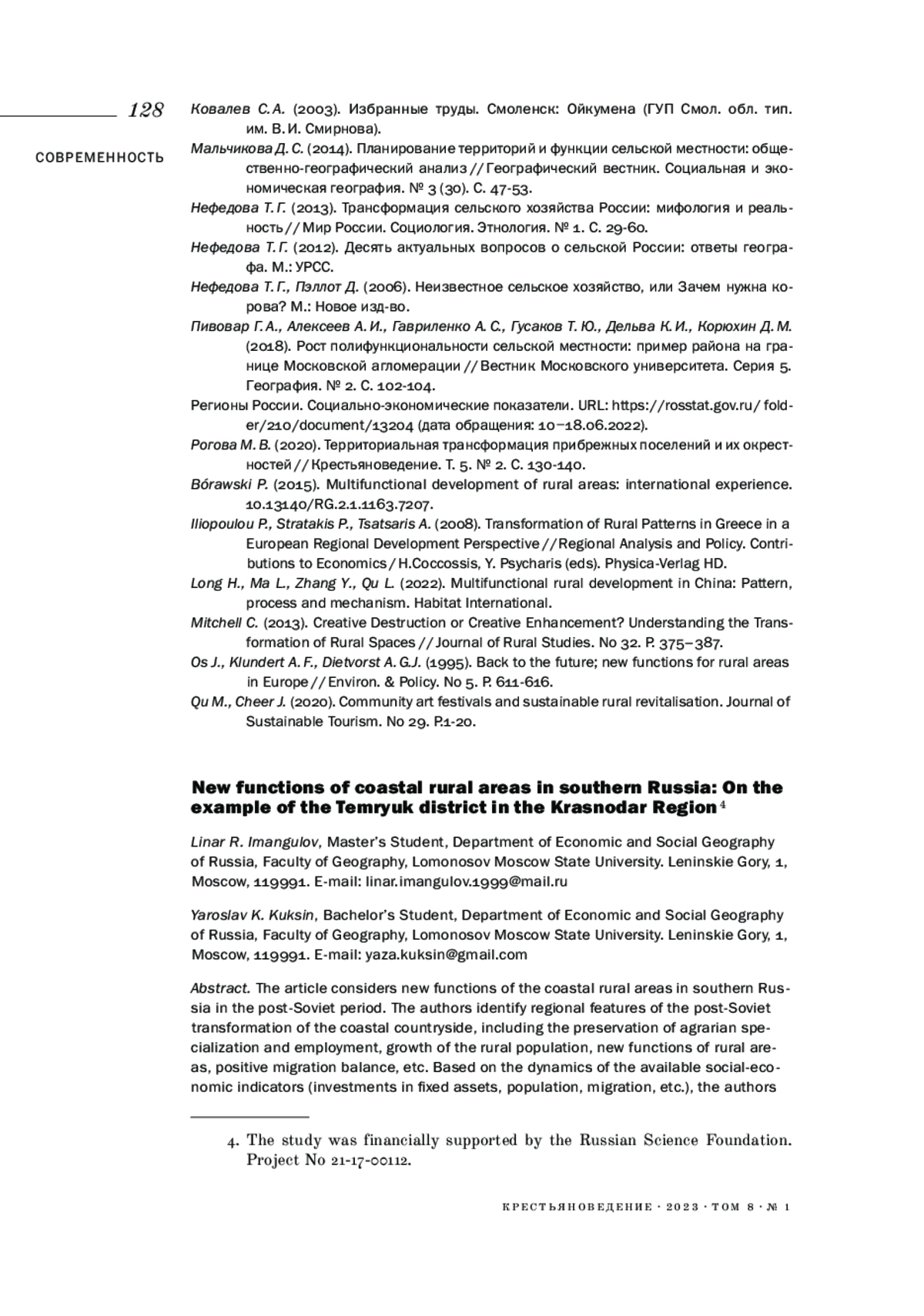 12. Мальчикова Д. С. (2014). Планирование территорий и функции сельской местности: общественно-географический анализ // Географический вестник. Социальная и экономическая география. № 3 (30). С. 47-53.