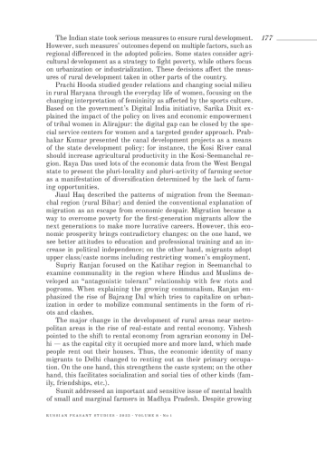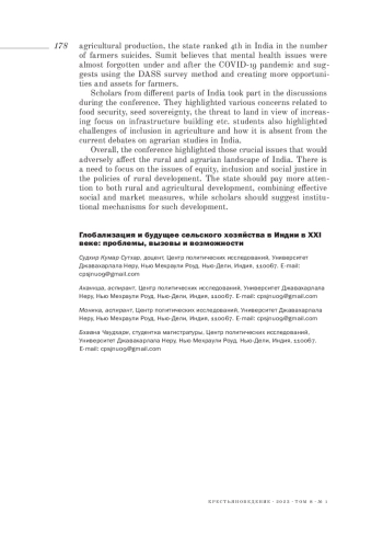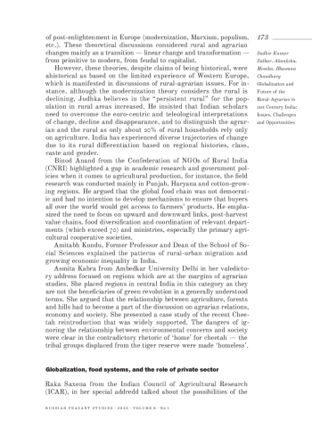 СУДХИР К. С., AKANKSHA A., MONIKA M., CHAUDHARY B. GLOBALIZATION AND FUTURE OF THE RURAL-AGRARIAN IN 21ST CENTURY INDIA: ISSUES, CHALLENGES AND OPPORTUNITIES // КРЕСТЬЯНОВЕДЕНИЕ. 2023. Т. 8 № 1