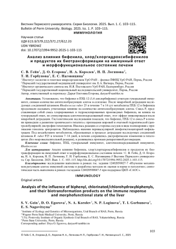 ГЕЙН С. В., ЕГОРОВА Д. О., КОРОЛЁВ Н. А., ЛОГИНОВА Н. П., ГОРБУНОВА Т. И., НАГОВИЦИНА Е. С. АНАЛИЗ ВЛИЯНИЯ БИФЕНИЛА, ХЛОР/ХЛОРГИДРОКСИБИФЕНИЛОВ И ПРОДУКТОВ ИХ БИОТР АНСФОРМАЦИИ НА ИММУННЫЙ ОТВЕТ И МОРФОФУНКЦИОНАЛЬНОЕ СОСТОЯНИЕ ПЕЧЕНИ // ВЕСТНИК ПЕРМСКОГО УНИВЕРСИТЕТА. СЕРИЯ: БИОЛОГИЯ. 2025. № 1