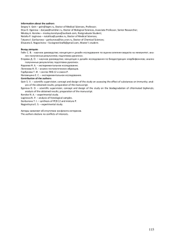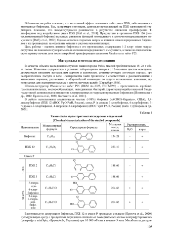 Установлено, что бифенил и ПХБ 12 (3,4-дихлорбифенил) угнетали гуморальный иммунитет, снижая количество антителообразующих клеток в селезенке. После микробной деградации исследуемых соединений штаммом Rhodococcus ruber 25 в течение 7 и 14 сут метаболиты ПХБ 12 и бифенила продолжали оказывать угнетающее влияние на количество антителообразующих клеток. Смесь Р, представляющая собой смесь хлорированных и гидроксилированных производных бифенила, не влияла на гуморальный ответ, но стимулировала клеточноопосредованный ответ, этот эффект нивелировался после микробной деградации. Гистологические исследования показали, что бифенил, ПХБ 12 и смесь Р в печени приводили к развитию хронического гепатита с признаками жировой и очаговой гидропической (центролобулярной) дистрофии гепатоцитов. Имелась реакция со стороны сосудов в виде полнокровия с признаками гемолиза эритроцитов. Наблюдались явления периваскулярной лимфогистиоцитарной инфильтрации. Под воздействием метаболитов, образованных в процессе деградации исследуемых соединений штаммом R. ruber Р25 в течении 7-14 дней, в печени сохранялись дистрофические изменения в гепатоцитах (без некровоспалительной реакции), и развивались признаки репаративной регенерации.