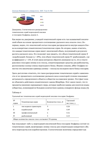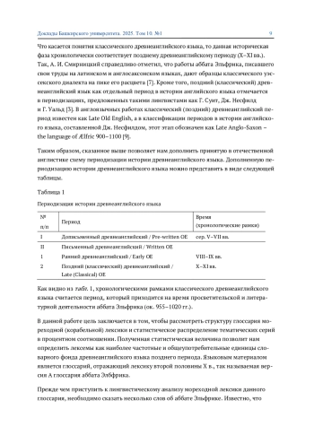 В данной статье рассматривается статистическое распределение тематических серий мореходной лексики в классическом древнеанглийском языке на материале глоссария Эльфрика. В работе представлена версия глоссария Эльфрика, датируемого концом X в. (так называемая версия А). Считается, что работы аббата Эльфрика (ок. 955-1020 гг.) являются образцами классического уэссекского диалекта древнеанглийского языка. В британской филологии этот период также известен как«поздний древнеанглийский». Глоссарий состоит из латинских лемм и древнеанглийских лексических единиц (глосс), расположенных по тематическим спискам. Семантический блок “Nomina Nauium” состоит из 39 глосс и включает в себя следующие тематические серии: «вид водного транспорта», «корабельный», «профессиональный» и «рыболовный».