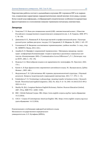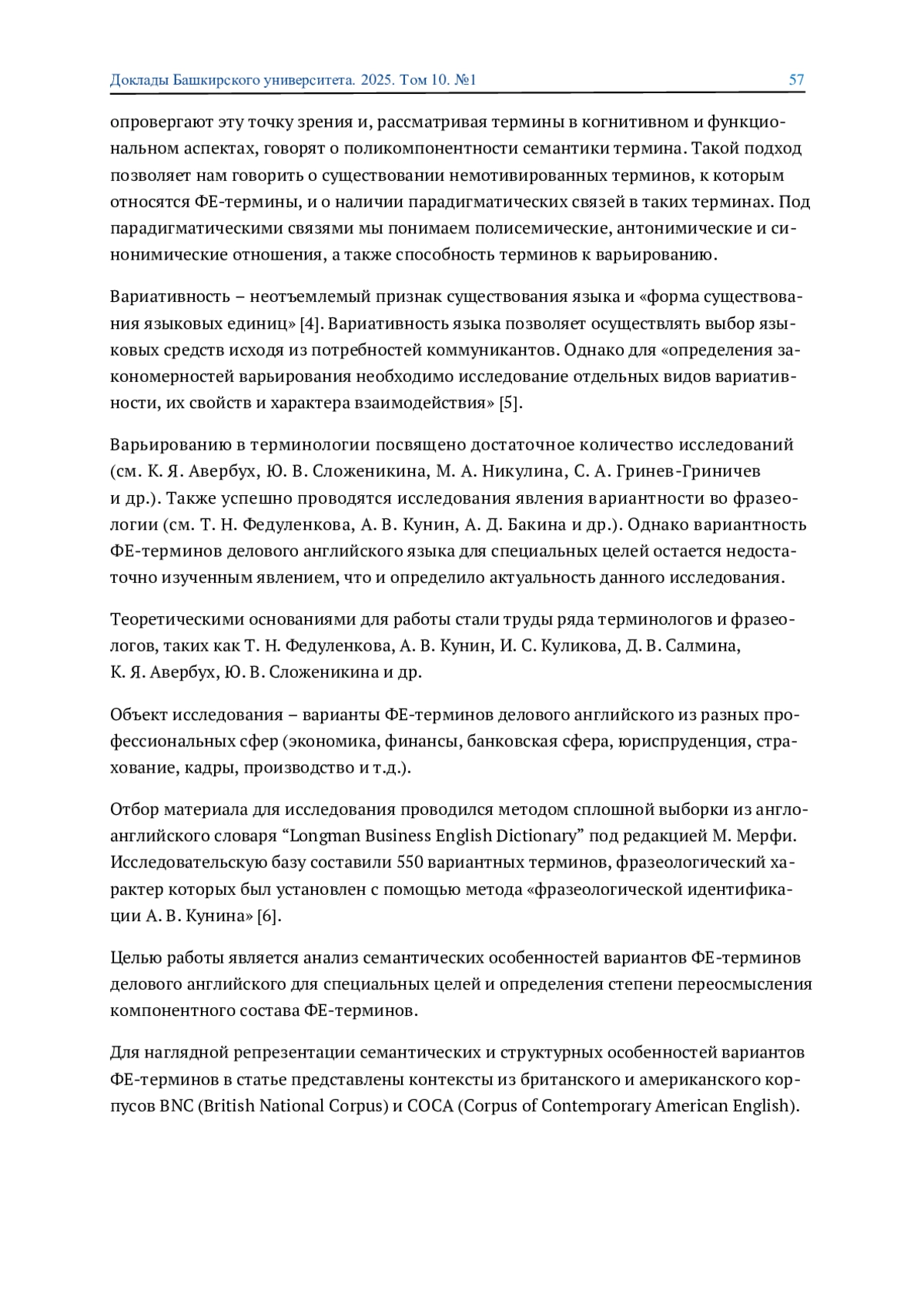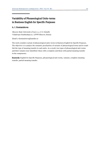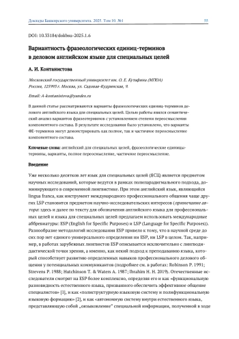 КОНТАНИСТОВА А. И. ВАРИАНТНОСТЬ ФРАЗЕОЛОГИЧЕСКИХ ЕДИНИЦ-ТЕРМИНОВ В ДЕЛОВОМ АНГЛИЙСКОМ ЯЗЫКЕ ДЛЯ СПЕЦИАЛЬНЫХ ЦЕЛЕЙ // ДОКЛАДЫ БАШКИРСКОГО УНИВЕРСИТЕТА. 2025. Т. 10 № 1