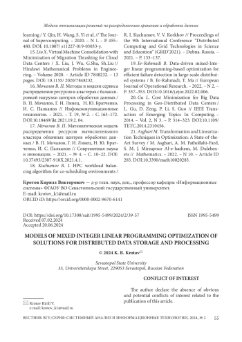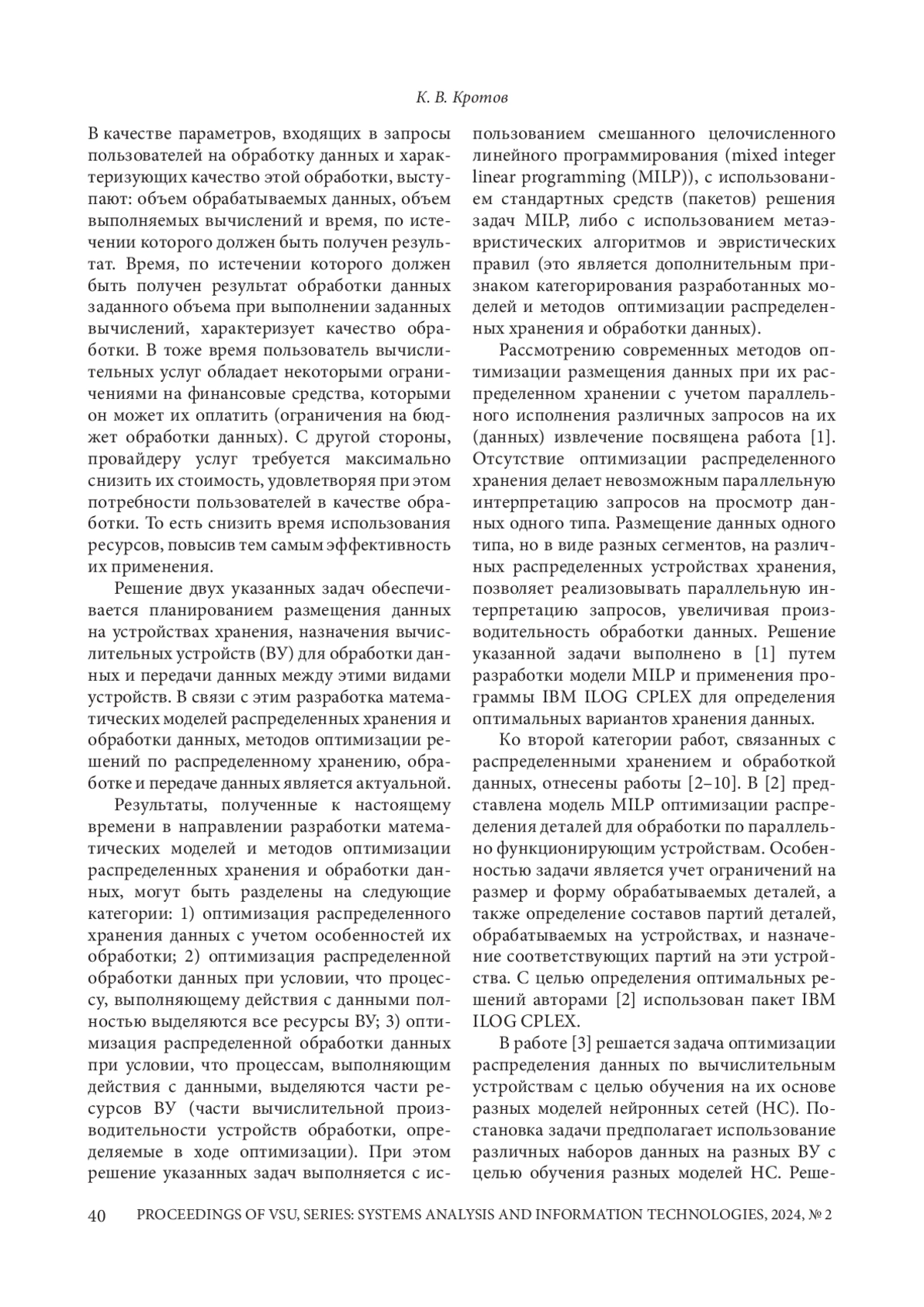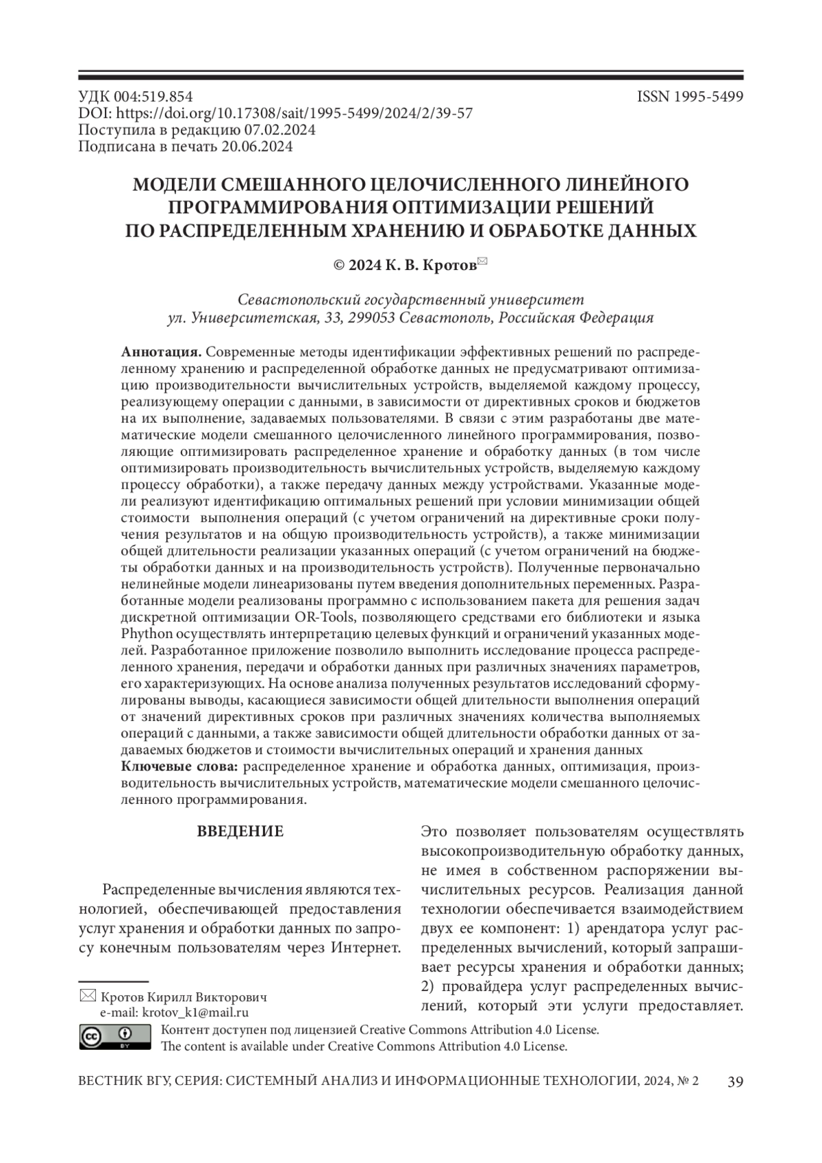 КРОТОВ К. В. МОДЕЛИ СМЕШАННОГО ЦЕЛОЧИСЛЕННОГО ЛИНЕЙНОГО ПРОГРАММИРОВАНИЯ ОПТИМИЗАЦИИ РЕШЕНИЙ ПО РАСПРЕДЕЛЕННЫМ ХРАНЕНИЮ И ОБРАБОТКЕ ДАННЫХ // ВЕСТНИК ВОРОНЕЖСКОГО ГОСУДАРСТВЕННОГО УНИВЕРСИТЕТА. СЕРИЯ: СИСТЕМНЫЙ АНАЛИЗ И ИНФОРМАЦИОННЫЕ ТЕХНОЛОГИИ. 2024. № 2