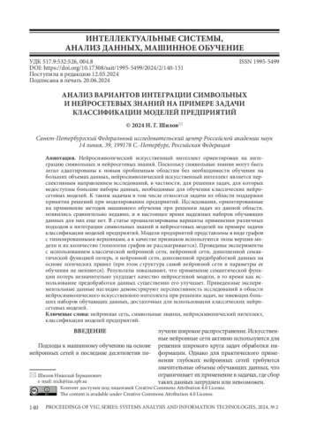 Статья: АНАЛИЗ ВАРИАНТОВ ИНТЕГРАЦИИ СИМВОЛЬНЫХ И НЕЙРОСЕТЕВЫХ ЗНАНИЙ НА ПРИМЕРЕ ЗАДАЧИ КЛАССИФИКАЦИИ МОДЕЛЕЙ ПРЕДПРИЯТИЙ (2024)