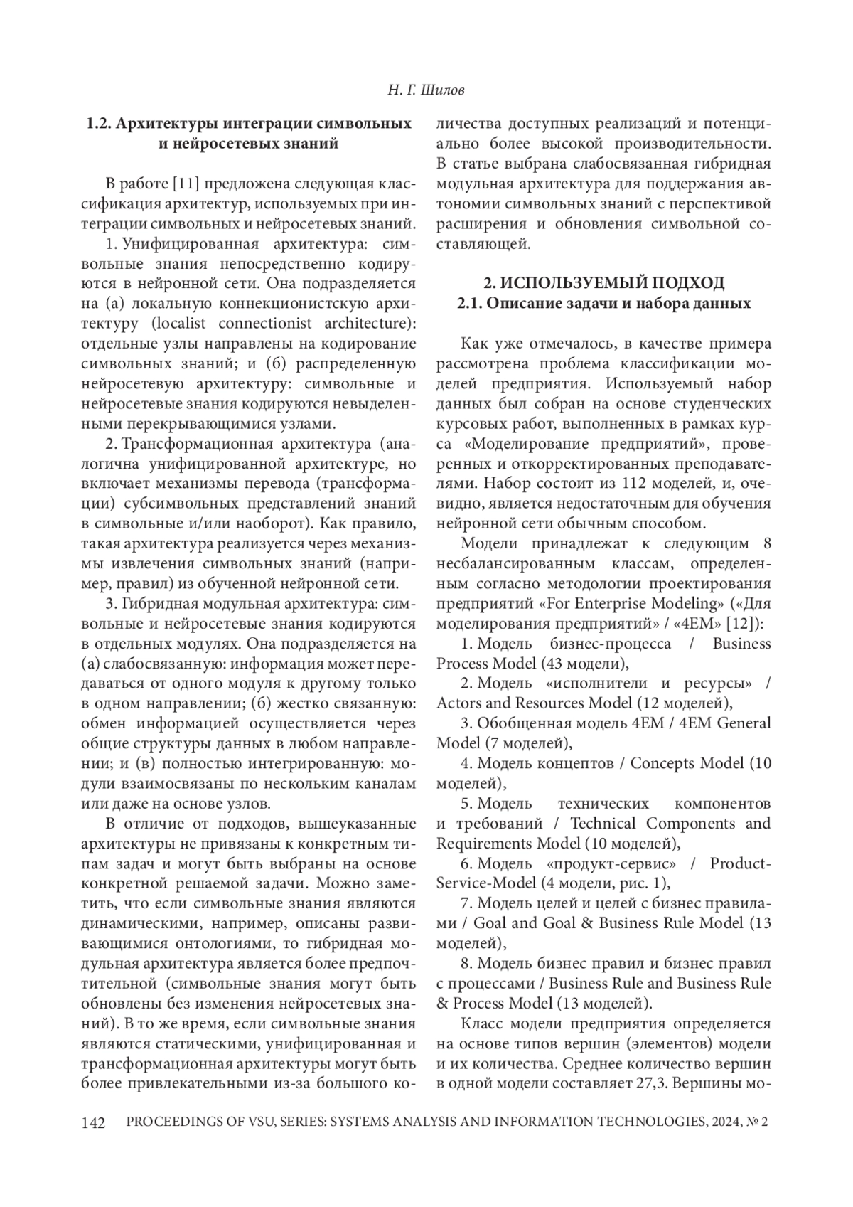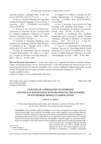ШИЛОВ Н. Г. АНАЛИЗ ВАРИАНТОВ ИНТЕГРАЦИИ СИМВОЛЬНЫХ И НЕЙРОСЕТЕВЫХ ЗНАНИЙ НА ПРИМЕРЕ ЗАДАЧИ КЛАССИФИКАЦИИ МОДЕЛЕЙ ПРЕДПРИЯТИЙ // ВЕСТНИК ВОРОНЕЖСКОГО ГОСУДАРСТВЕННОГО УНИВЕРСИТЕТА. СЕРИЯ: СИСТЕМНЫЙ АНАЛИЗ И ИНФОРМАЦИОННЫЕ ТЕХНОЛОГИИ. 2024. № 2