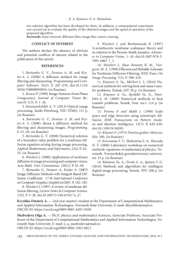 1. Borisenko G. V. A diffusion method for image filtering and sharpening / G. V. Borisenko, A. M. Denisov, A. S. Krylov // Programming and Computer Software. - 2008. - Vol. 34. - № 5. -P. 267-270,. DOI: 10.1134/S0361768808050034 EDN: LLLAZB
