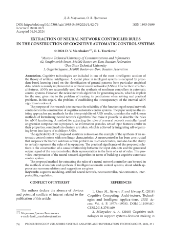 Когнитивные технологии входят в один из самых «интеллектуальных» разделов теории искусственного интеллекта. Особое место в интеллектуальных системах занимает обучение по прецедентам, основанное на выявлении общих закономерностей по частным эмпирическим данным, реализуемое главным образом в искусственных нейронных сетях (ИНС). Благодаря своим структурным особенностям, ИНС успешно применяются для синтеза нелинейных регуляторов в автоматических системах управления, однако неявный для пользователя нейросетевой алгоритм формирования результатов порождает проблему доверия к его выводам при решении реальных практических задач, в связи с чем актуальна задача установления «прозрачности» внутреннего алгоритма ИНС. Целью исследования является повышение достоверности функционирования нейро-сетевых регуляторов при построении когнитивных систем автоматического управления. В работе выполнен анализ существующих подходов и методов интерпретируемости результатов ИНС, рассмотрены известные способы формализации нейросетевых алгоритмов, позволяющие выполнить описание правил функционирования ИНС. Предложена методика извлечения правил нейросетевого регулятора на основе гранулярных вычислений, где в качестве информационных гранул принимаются множества схожих по своим свойствам входных признаков, объединенных в кластеры, что достигается путем интеграции в слои многослойных ИНС самоорганизующихся слоев. Применимость предложенных решений показана на примере синтеза системы автоматического регулирования, имеющей нелинейные характеристики. Выполнено построение нейросетевого регулятора, превосходящего по своим характеристикам известные решения данной задачи, а также обладающего возможностью вербального представления правил своего функционирования. Практической значимостью предложенных решений является построение причинно-следственной связи между наборами входных данных и формируемым выходным сигналом нейросетевого регулятора, их представлением в виде совокупности правил, обеспечивающих интерпретацию нейросетевого алгоритма в аспекте построения когнитивной системы автоматического управления. Предложенная методика извлечения правил нейросетевого регулятора может найти применение в методах анализа и синтеза интеллектуальных систем автоматического управления, о чем даны соответствующие рекомендации и предложения.