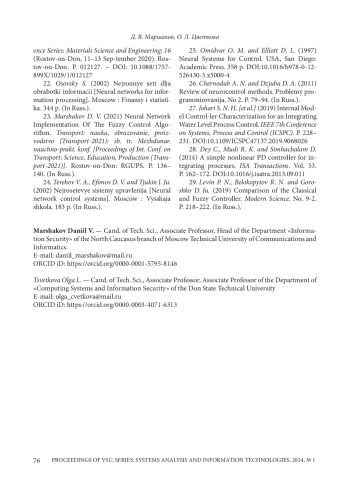 23. Маршаков Д. В. Нейросетевая реализация алгоритма нечёткого регулирования / Д. В. Маршаков // Транспорт: наука, образование, производство: сб. науч. тр. Междунар. научно-практ. конф. (г. Ростов н/Д, 19-21 апреля 2021 г.). - Ростов н/Д: РГУПС, 2021. - С. 136-140. EDN: DRFUBM