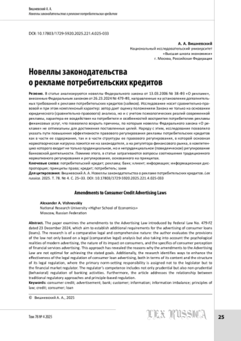 В статье анализируются новеллы Федерального закона от 13.03.2006 № 38-ФЗ «О рекламе», внесенные Федеральным законом от 26.23.2024 № 479-ФЗ, направленные на установление дополнительных требований к рекламе потребительских кредитов (займов). Исследование носит сравнительно-правовой и при этом комплексный характер: автор дает оценку положениям Закона не только на основании юридического (сравнительно-правового) анализа, но и с учетом психологических реалий современной рекламы, характера ее воздействия на потребителя и особенностей восприятия потребителем рекламы финансовых услуг, что позволило вскрыть причины, по которым новеллы Федерального закона «О рекламе» не оптимальны для достижения поставленных целей. Наряду с этим, исследование позволило указать пути повышения эффективности правового регулирования рекламы потребительских кредитов как в части ее содержания, так и в части структуры ее правового регулирования, в которой основная нормотворческая нагрузка ложится не на законодателя, а на регулятора финансового рынка, в компетенцию которого входит не только пруденциальное, но и непруденциальное (поведенческое) регулирование банковской деятельности. Помимо этого, в статье затрагиваются вопросы соотношения традиционного нормативного регулирования и регулирования, основанного на принципах.