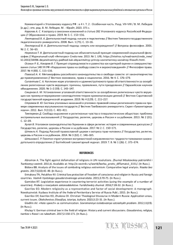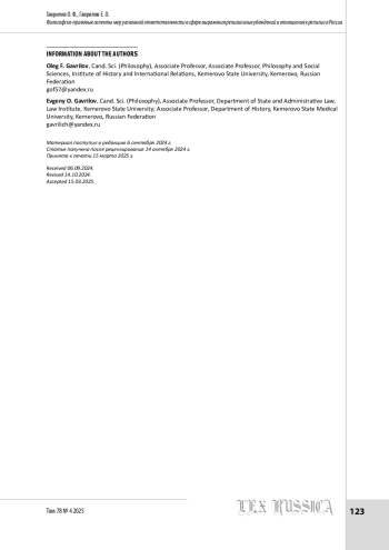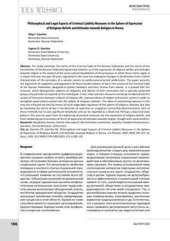 ГАВРИЛОВ О. Ф., ГАВРИЛОВ Е. О. ФИЛОСОФСКО-ПРАВОВЫЕ АСПЕКТЫ МЕР УГОЛОВНОЙ ОТВЕТСТВЕННОСТИ В СФЕРЕ ВЫРАЖЕНИЯ РЕЛИГИОЗНЫХ УБЕЖДЕНИЙ И ОТНОШЕНИЯ К РЕЛИГИИ В РОССИИ // LEX RUSSICA (РУССКИЙ ЗАКОН). 2025. ТОМ 78, № 4