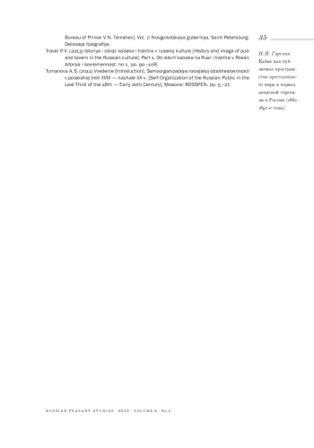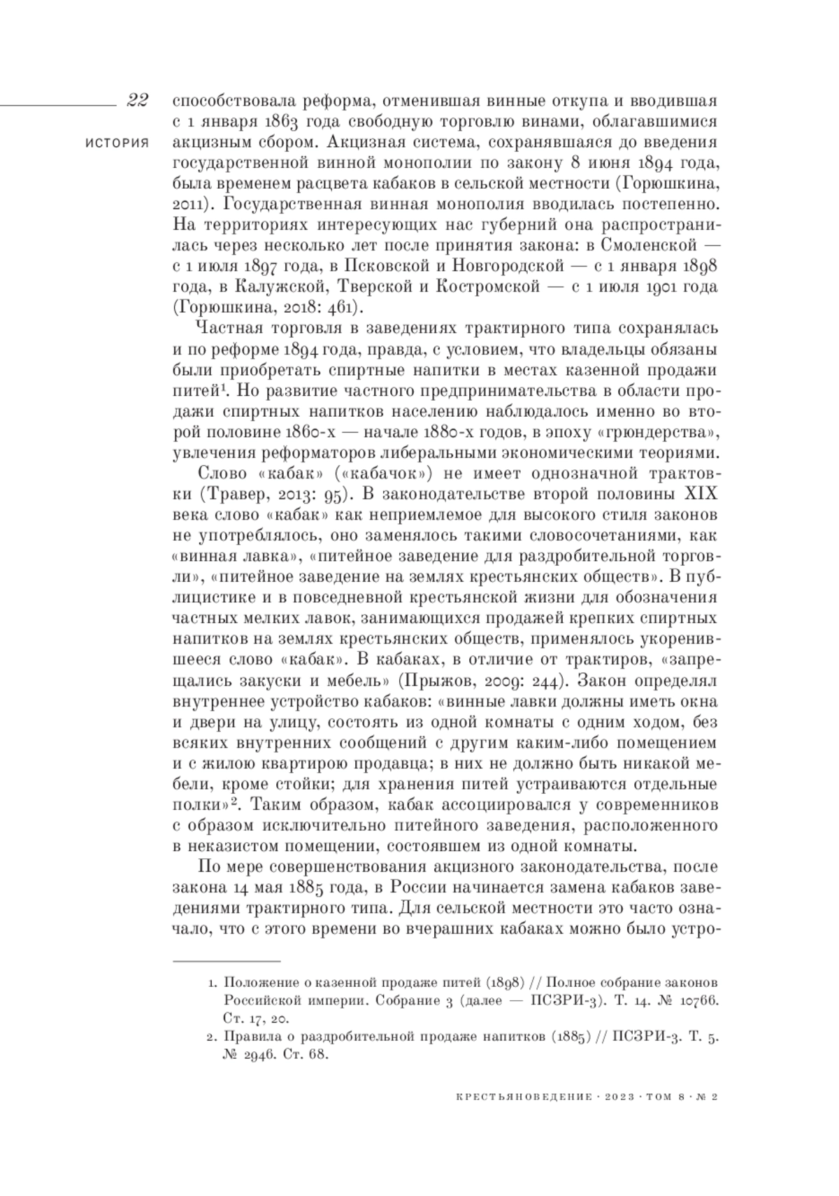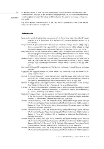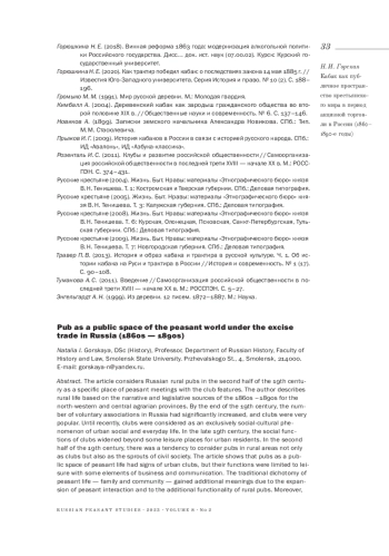 ГОРСКАЯ Н. И. КАБАК КАК ПУБЛИЧНОЕ ПРОСТРАНСТВО КРЕСТЬЯНСКОГО МИРА В ПЕРИОД АКЦИЗНОЙ ТОРГОВЛИ В РОССИИ (1860-Е-1890-Е ГОДЫ) // КРЕСТЬЯНОВЕДЕНИЕ. 2023. Т. 8 № 2