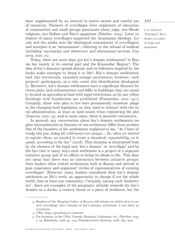 The article focuses on kin’s domains - plots of at least one hectare, which became so called since the early 2000s, after the publication of the series of books by Vladimir Megre - Ringing Cedars of Russia. Megre described his meeting with the Siberian hermit Anastasia and her nostalgic stories about the kin’s domain settlements of the Vedic Russia. Readers, inspired by this narrative of the ‘golden age’, tried to create this utopia in different Russian regions - according to the followers, there are more than 500 such settlements. Kin’s domain is usually organized on agricultural land and needs the entire infrastructure, so practical skills, technical knowledge and creativity are valued by the participants. In many ways, such settlements follow the global trend of ecovillages as laboratories of sustainable development, autonomy, harmonious coexistence of man and nature, spiritual development and healing. The author shows how the economic and ideological crisis of the 1990s determined the rise of alternative teachings and the enthusiasm of builders of a bright future. At the same time, many active participants of first ecovillages and kin’s domains followed the Soviet discourse, emphasizing the significance of Soviet morality and creative self-activity. The article is based on the field studies conducted in 2008-2021 in kin’s domain settlements and at the meetings of Anastasians, and on the Internet sources.
