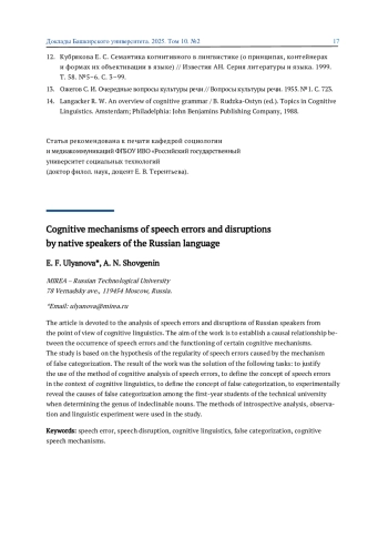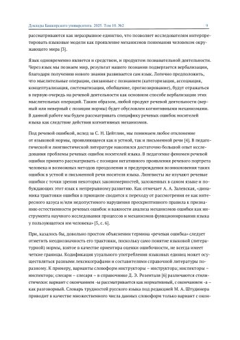 УЛЬЯНОВА Э. Ф., ШОВГЕНИН А. Н. КОГНИТИВНЫЕ МЕХАНИЗМЫ ВОЗНИКНОВЕНИЯ РЕЧЕВЫХ ОШИБОК И СБОЕВ У НОСИТЕЛЕЙ РУССКОГО ЯЗЫКА // ДОКЛАДЫ БАШКИРСКОГО УНИВЕРСИТЕТА. 2025. Т. 10 № 2