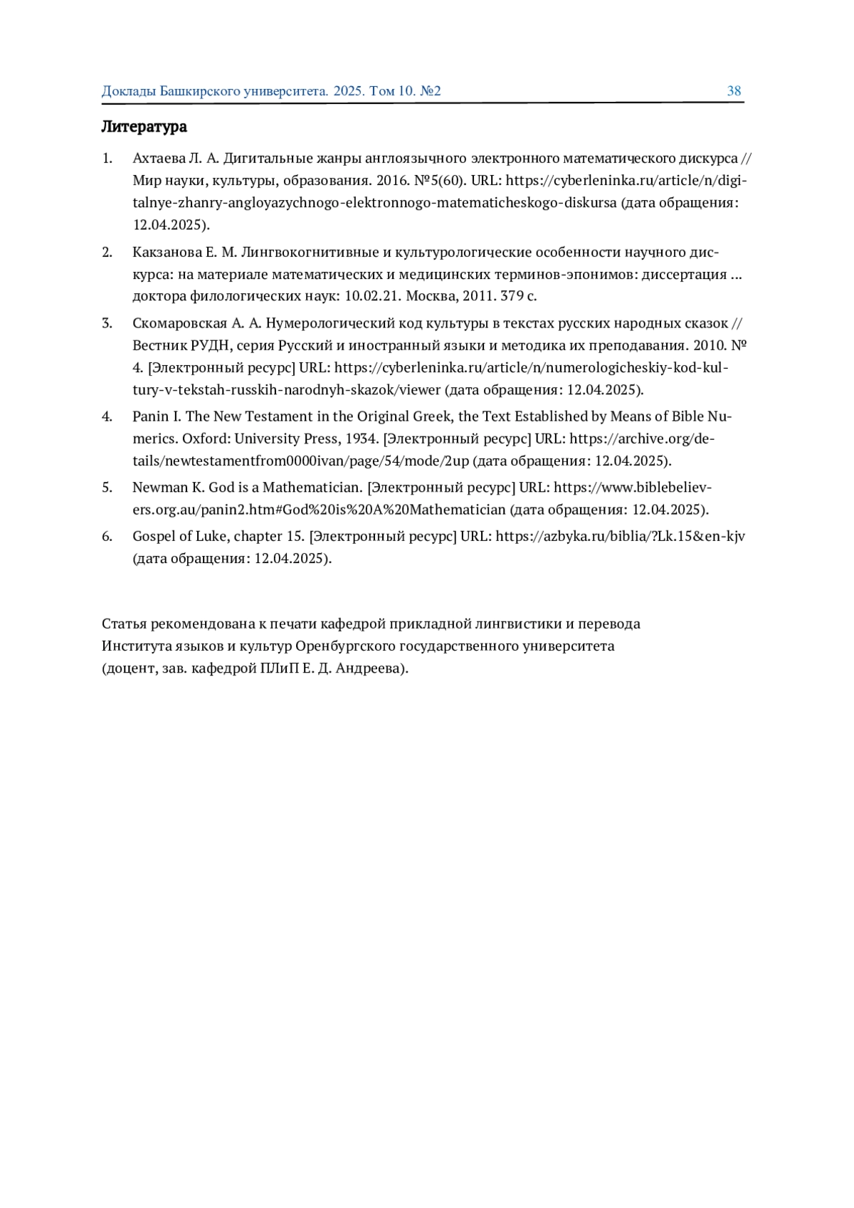 1. Ахтаева Л. А. Дигитальные жанры англоязычного электронного математического дискурса // Мир науки, культуры, образования. 2016. №5(60). URL: https://cyberleninka.ru/article/n/digitalnye-zhanry-angloyazychnogo-elektronnogo-matematicheskogo-diskursa (дата обращения: 12.04.2025). EDN: WXGWMJ