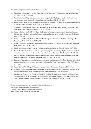 17. Künzli A. How subtitling professionals perceive changes in working conditions: An interview study in German-speaking countries // Translation and Interpreting Studies. The Journal of the American Translation and Interpreting Studies Association, 2023. V. 18. No. 1. P. 91-112.