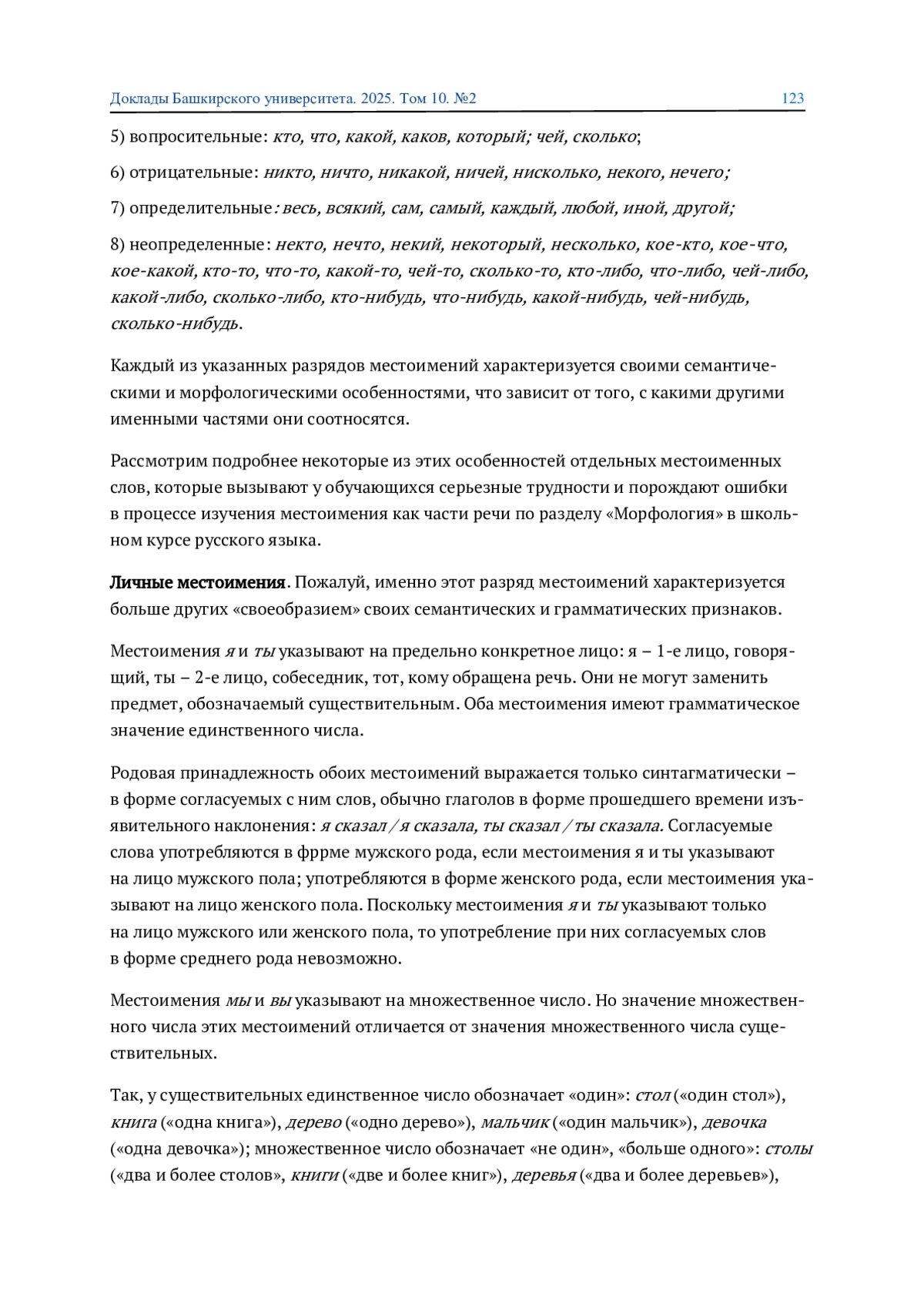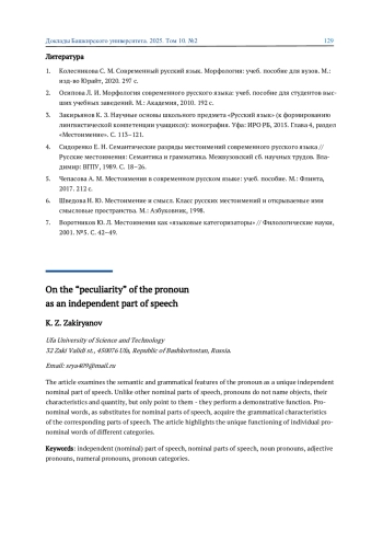 3. Закирьянов К. З. Научные основы школьного предмета “Русский язык” (к формированию лингвистической компетенции учащихся): монография. Уфа: ИРО РБ, 2015. Глава 4, раздел “Местоимение”. С. 113-121.