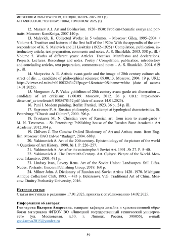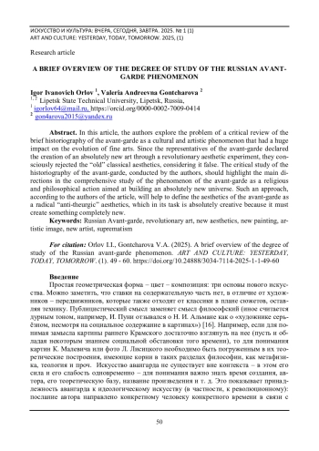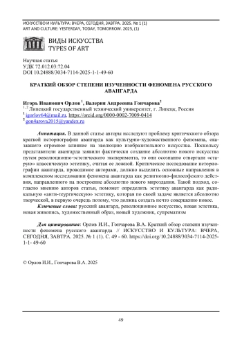 ГОНЧАРОВА В. А., ОРЛОВ И. И. КРАТКИЙ ОБЗОР СТЕПЕНИ ИЗУЧЕННОСТИ ФЕНОМЕНА РУССКОГО АВАНГАРДА // ИСКУССТВО И КУЛЬТУРА: ВЧЕРА, СЕГОДНЯ, ЗАВТРА. 2025. № 1 (1)