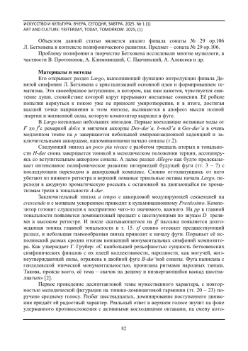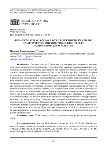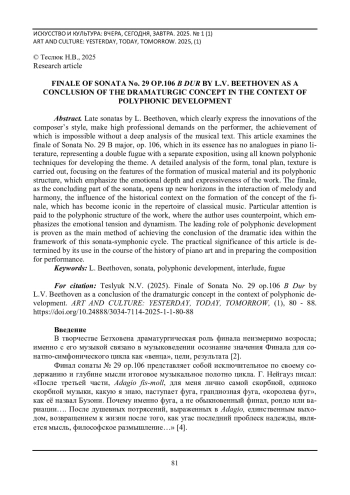 ТЕСЛЮК Н. В. ФИНАЛ СОНАТЫ № 29 ОР.106 B DUR Л. В. БЕТХОВЕНА КАК ВЫВОД ДРАМАТУРГИЧЕСКОЙ КОНЦЕПЦИИ В КОНТЕКСТЕ ПОЛИФОНИЧЕСКОГО РАЗВИТИЯ // ИСКУССТВО И КУЛЬТУРА: ВЧЕРА, СЕГОДНЯ, ЗАВТРА. 2025. № 1 (1)