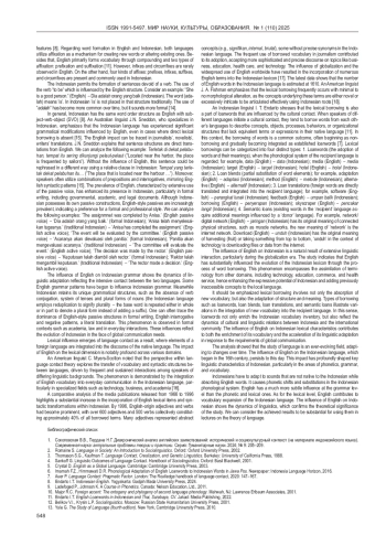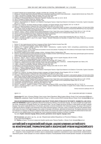 СОКОЛОВСКАЯ В. В., ПЕРДАНА Н. Г. АНГЛИЙСКИЙ И ИНДОНЕЗИЙСКИЙ ЯЗЫКИ: АНАЛИЗ ВЛИЯНИЯ АНГЛИЙСКОГО НА ФОНЕТИЧЕСКИЙ, ГРАММАТИЧЕСКИЙ И ЛЕКСИЧЕСКИЙ УРОВНИ ИНДОНЕЗИЙСКОГО // МИР НАУКИ, КУЛЬТУРЫ, ОБРАЗОВАНИЯ. 2025. № 1 (110)