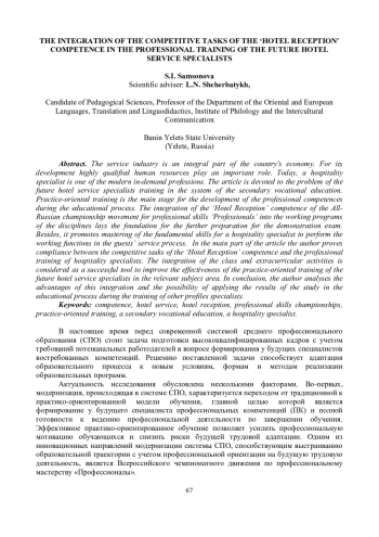 Сфера услуг представляет собой неотъемлемую часть экономики страны, для развития которой важную роль играет высококвалифицированный кадровый потенциал. Сегодня специалист по гостеприимству является одной из современных востребованных профессий. Данная статья посвящена вопросу подготовки будущих специалистов гостиничного сервиса в системе среднего профессионального образования. Основным этапом для формирования профессиональных компетенций в рамках образовательного процесса выступает практико-ориентированное обучение. Интеграция компетенции «Администрирование отеля» Всероссийского чемпионатного движения по профессиональному мастерству «Профессионалы» в рабочие программы дисциплин закладывает основу для дальнейшей подготовки к демонстрационному экзамену и способствует освоению фундаментальных навыков, необходимых специалисту по гостеприимству для выполнения трудовых функций в процессе обслуживания гостей. В основной части работы автор приводит обоснование соответствия конкурсных заданий компетенции «Администрирование отеля» профессиональной подготовке специалистов по гостеприимству. Интеграция урочной и внеурочной деятельности рассматривается в качестве успешного инструмента для повышения эффективности практико-ориентированной подготовки будущих специалистов гостиничного сервиса в соответствующей предметной области. В заключении автор анализирует преимущества данной интеграции и возможность применения результатов исследования в образовательном процессе при подготовке специалистов других профилей.