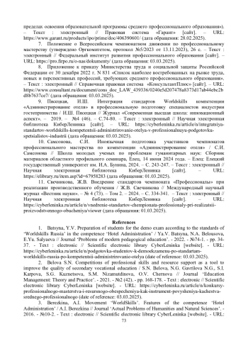 1. Бацына, Я.В. Подготовка студентов к демоэкзамену по стандартам “Worldskills Russia” по компетенции “Администрирование отеля” / Я.В. Бацына, Н.А. Белоусова, Е.Ю. Саляева // Журнал “Проблемы современного педагогического образования”. - 2022. - №74-1. - С. 34-37. - Текст: электронный // Научная электронная библиотека КиберЛенинка [сайт]. - URL: https://cyberleninka.ru/article/n/podgotovka-studentov-k-demoekzamenu-po-standartam-worldskills-russia-po-kompetentsii-administrirovanie-otelya (дата обращения: 03.03.2025).