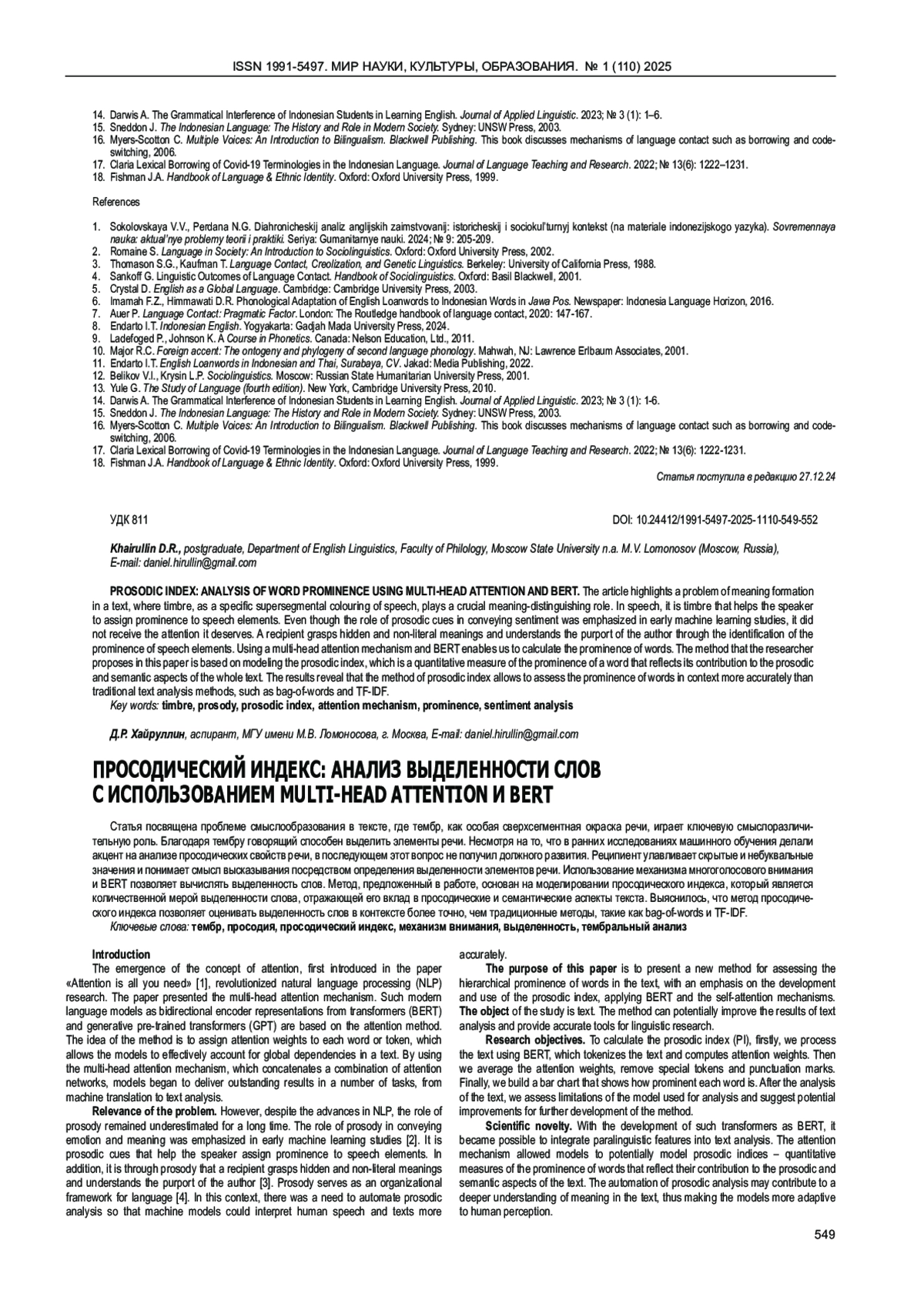 Статья посвящена проблеме смыслообразования в тексте, где тембр, как особая сверхсегментная окраска речи, играет ключевую смыслоразличи тельную роль. Благодаря тембру говорящий способен выделить элементы речи. Несмотря на то, что в ранних исследованиях машинного обучения делали акцент на анализе просодических свойств речи, в последующем этот вопрос не получил должного развития. Реципиент улавливает скрытые и небуквальные значения и понимает смысл высказывания посредством определения выделенности элементов речи. Использование механизма многоголосового внимания и BERT позволяет вычислять выделенность слов. Метод, предложенный в работе, основан на моделировании просодического индекса, который является количественной мерой выделенности слова, отражающей его вклад в просодические и семантические аспекты текста. Выяснилось, что метод просодического индекса позволяет оценивать выделенность слов в контексте более точно, чем традиционные методы, такие как bag-of-words и TF-IDF.
