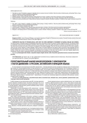 В статье проводится сопоставительный анализ ФЕ с компонентами - глаголами движения в русском, английском и немецком языках. В основу анализа был положен учет лексико-морфологического состава компонентов, а также качество и количество значений ФЕ данного типа. Исследование показало, что ФЕ с глаголами движения широко распространены в исследуемых языках. Они составляют наиболее употребительную часть глагольной лексики. Во всех трех языках имеется множество общих черт. С отобранными нами глаголами движения в указанных языках образуются фразеологизмы, имеющие грамматическую структуру свободных словосочетаний нескольких типов. Общим для них является тип ФЕ, которые имеют грамматическую структуру предложения. Другой тип общий для трех языков - фразеологизмы, состоящие из глагола и существительного, а также глагола и прилагательного. В английском языке преобладают фразеологизмы со структурой глагол + прилагательное. На основе учета лексической вариантности различаются ФЕ различных структурно-семантических группировок.
